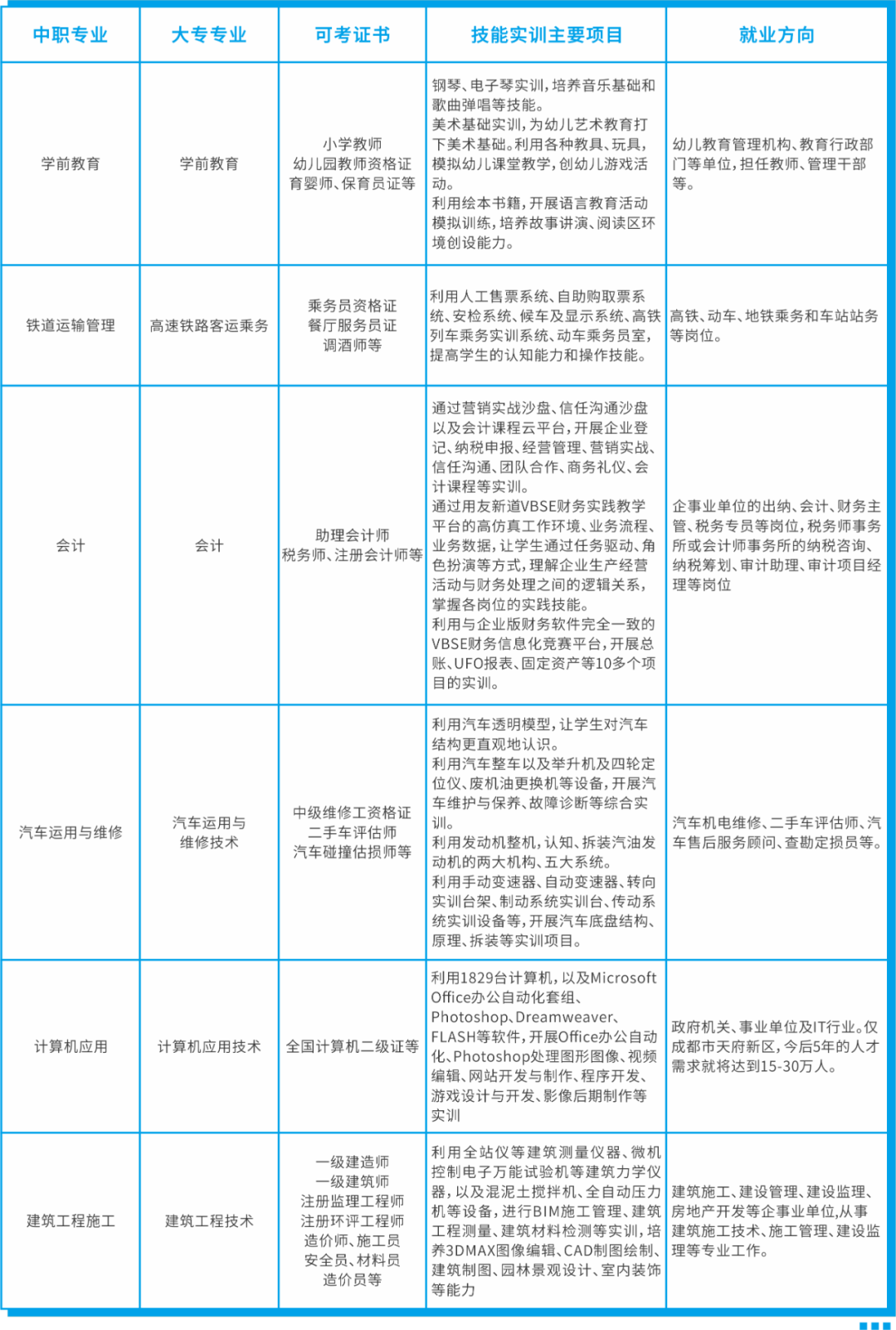 2020年,学院五年制高职面向四川省初中毕业生,招收学前教育、铁道运输管理、会计、汽车运用与维修、计算机应用、建筑工程施工6个专业的新生。如学生有需求,升专科时还可转读早期教育、护理等专业。