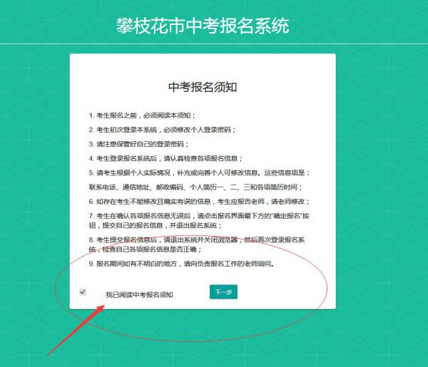 1、 初次登录,系统显示“中考报名须知”,考生认真阅读“中考报名须知”后,勾选页面下方的“我已阅读中考报名须知”复选框,然后点击“下一步”按钮,进入报名系统。