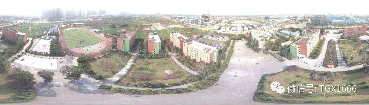 以前看到过这样的照片,这就是很平淡的在学校对面工厂上方进行一个俯视拍摄,就成了这个样子,但是,樊老师远远不满足这样的视角,火了很久的全景照片樊老师也想接触一下,所以,2月16日下午樊老师带着飞机,去操场里飞了一下,拍了一组照片,然后进行编辑,最开始的时候,19张照片一起合成了下图这样的一个照片,乍一看,有点畸形,其实,用手机拍过全景的人都晓得,这是很正常的。