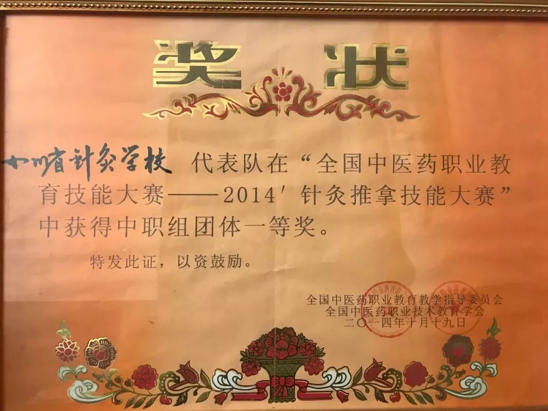 2014年参加全国中医药职业教育第二届“针灸推拿”技能大赛,学校代表队荣获“中职组团体第一名”,集体项目第一名。