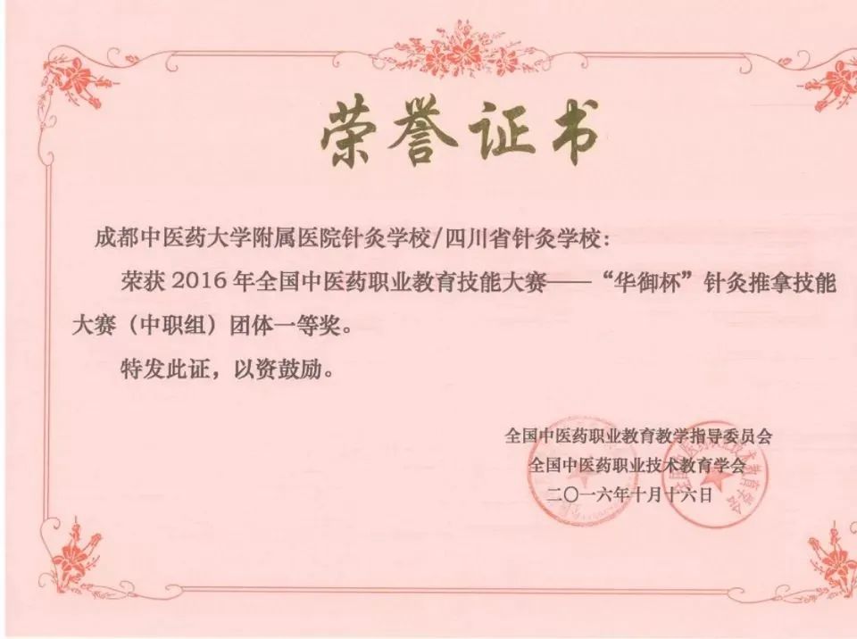 2016年全国中医药职业教育技能大赛——“华御杯”针灸推拿技能大赛,荣获得“团体一等奖”“健身功法一等奖”