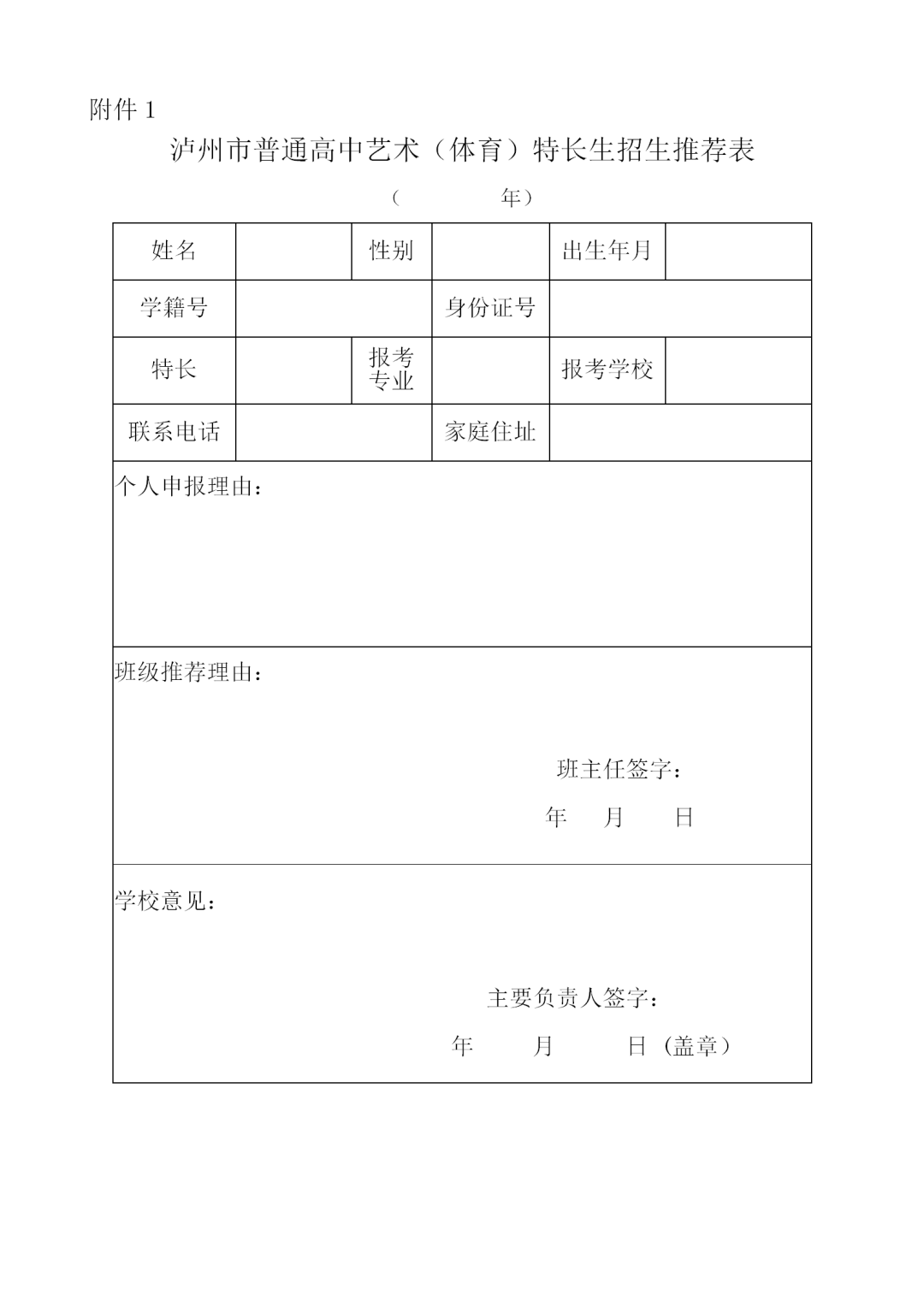 3、未获得上述资格者,在初中阶段艺术素质测评和体质健康标准测试达到优秀等级的学生,填写《泸州市普通高中艺体特长生招生推荐表》(以下简称《推荐表》,见附件1),经学校签署意见并加盖学校公章后也可以报考。