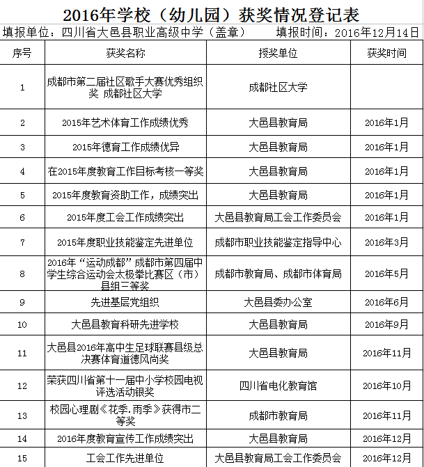| 17 | 年度大邑县社区教育学院工作成绩显著受表彰 | 大邑县教育局 | 2012年12月 |