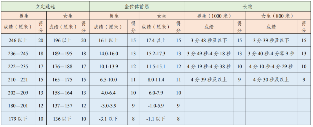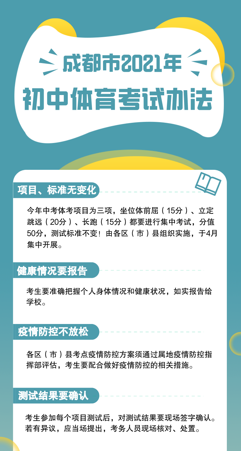 2021年成都市高中阶段教育学校统一招生体育考试项目包括坐位体前屈(15分)、立定跳远(20分)和长跑(男生:1000米,女生:800米,15分),总分50分。体育考试由各区(市)县统一组织实施,成都市所有参加中考报名的学生(含成都市户籍的往届生、成都市外回户籍所在区<市>县报名的应届初中毕业生等)均要参加坐位体前屈、立定跳远和长跑三个项目考试(评分标准见附件)。