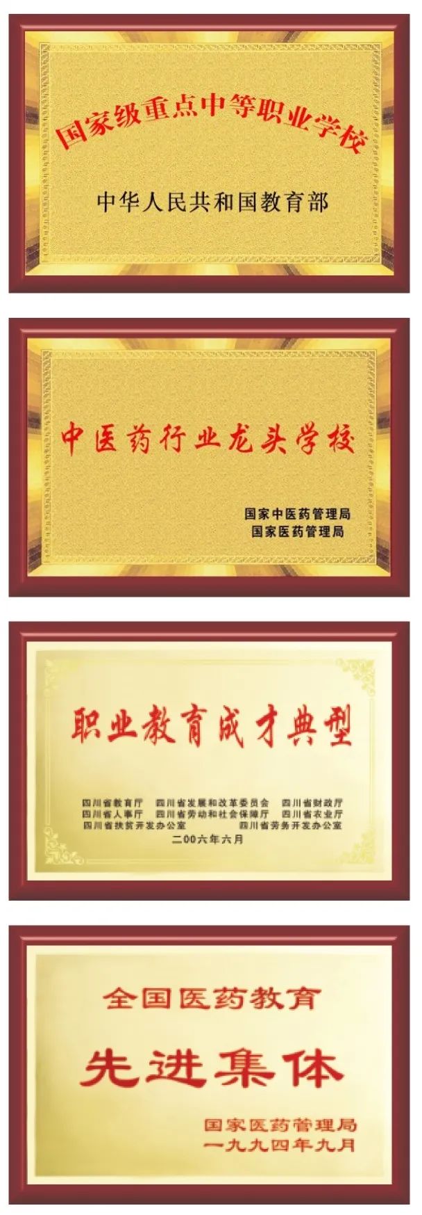 国家级重点中专、四川省示范中等职业学校、国家中医药行业龙头学校、国家和四川省中医药文化宣传教育基地、四川省首批“三名工程”(名校、名专业、名实训基地)建设学校。