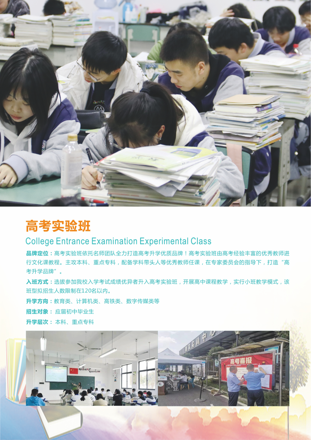 我校本着“向省内高校输送优质学生”的战略定位,打造立体高考模式,重点开设全日制“高考实验班”、“艺体升学班“、“国防教育特色班”等多种班型,根据学生个人情况选择。