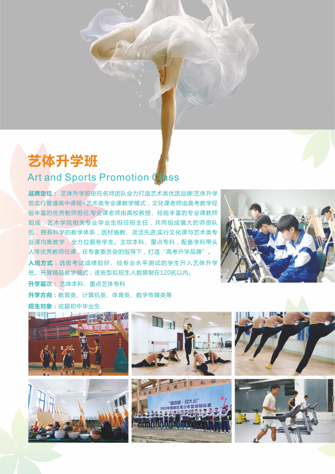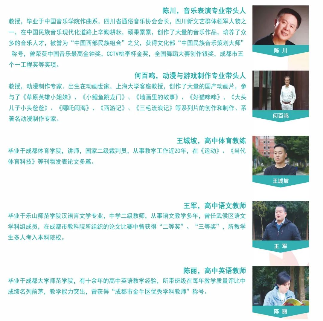 高考升学贯通培养优势:学校严格按照高中教学培养模式鼓励学生通过高考,实现大学梦想!可报考四川农业大学、四川音乐学院、四川传媒学院、成都艺术职业大学、四川工商学院、成都体育学院等优质高等院校。