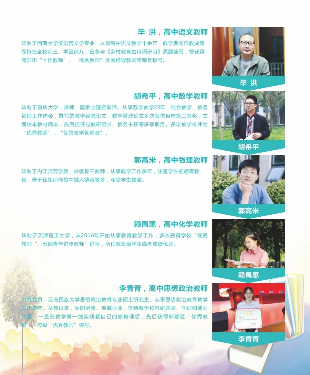 学校师资力量雄厚,拥有由陈川教授、何百鸣教授、周成教授、范奇云教授、赵海峰教授等组成的专家教授团队;由胡希平老师、毕洪老师、王城坡老师、王军老师、陈丽老师、赖禹惠老师、方静老师等组成的特级教师团队;由刘洪耀教授、林晓东教授、刘一非教授、陈元亨教授、鲁工圆教授等组成的专业教授团队。
