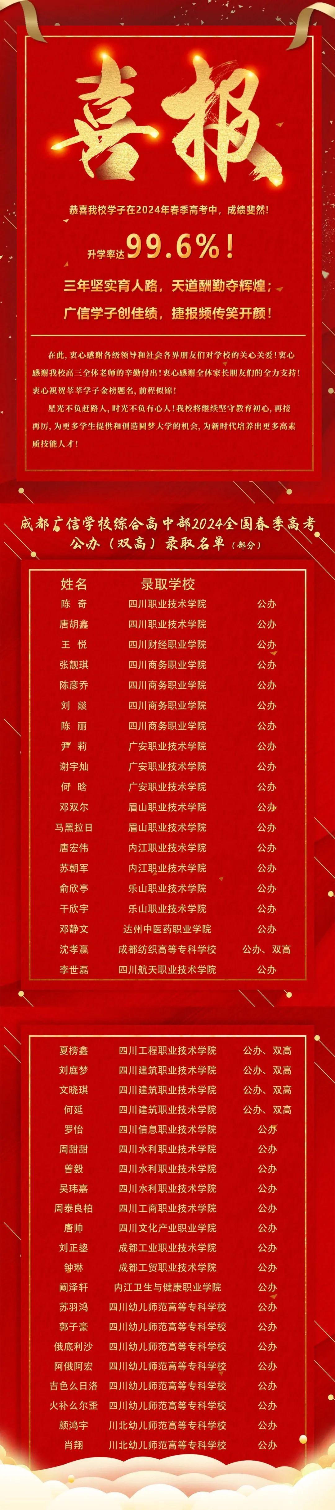 我校学子在2024年春季高考中成绩斐然!升学率达99.6%!