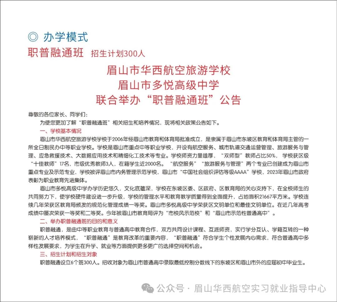 眉山市华西航空旅游学校是经眉山市教育局批准成立的全日制民办中等职业学校。2023年学校与眉山市多悦高级中学联合举办“职普融通班”。