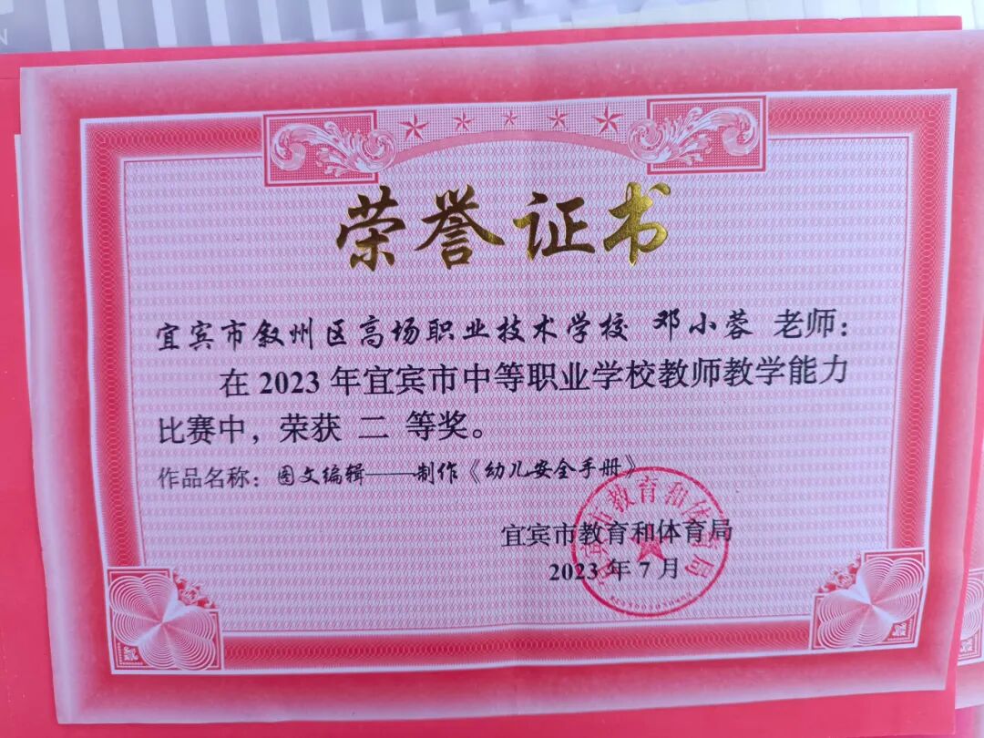 学校教育教学成效卓著。学校连续十余年被评为宜宾市或叙州区(原宜宾县)教学质量一、二等奖;仅2019年至今,学校美发与形象设计、服装、食品生物工艺、中西面点、幼儿保育等专业的老师和学生就有33人次获省级技能竞赛奖项,159人次获市级技能大赛奖项;文艺、体育、科技创新等活动获奖千余人次。学校连续两年参加省市中职学生技能大赛,获得叙州区第一名:2023年市中职技能大赛获得团体一等奖1个、二等奖1个、三等奖5个,个人二等奖1个、三等奖2个;2022年夺得省赛一等奖1个、二等奖3个、三等奖1个,2023年夺得省赛一等奖1个、二等奖2个、三等奖3个。