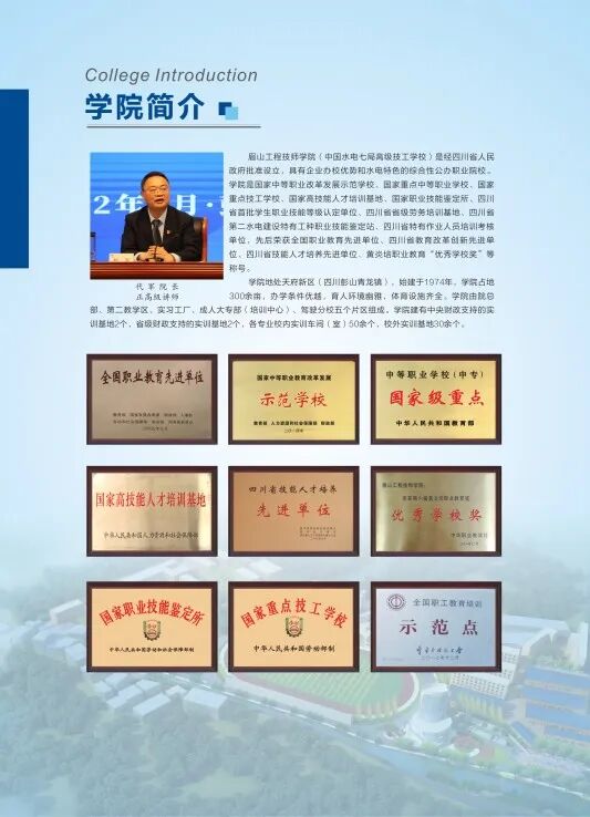 眉山工程技师学院(中国水电七局高级技工学校)是经四川省人民政府批准设立,由眉山市人民政府与中国水利水电第七工程局有限公司共建的一所具有企业办校优势和水电特色的综合性公办职业院校。