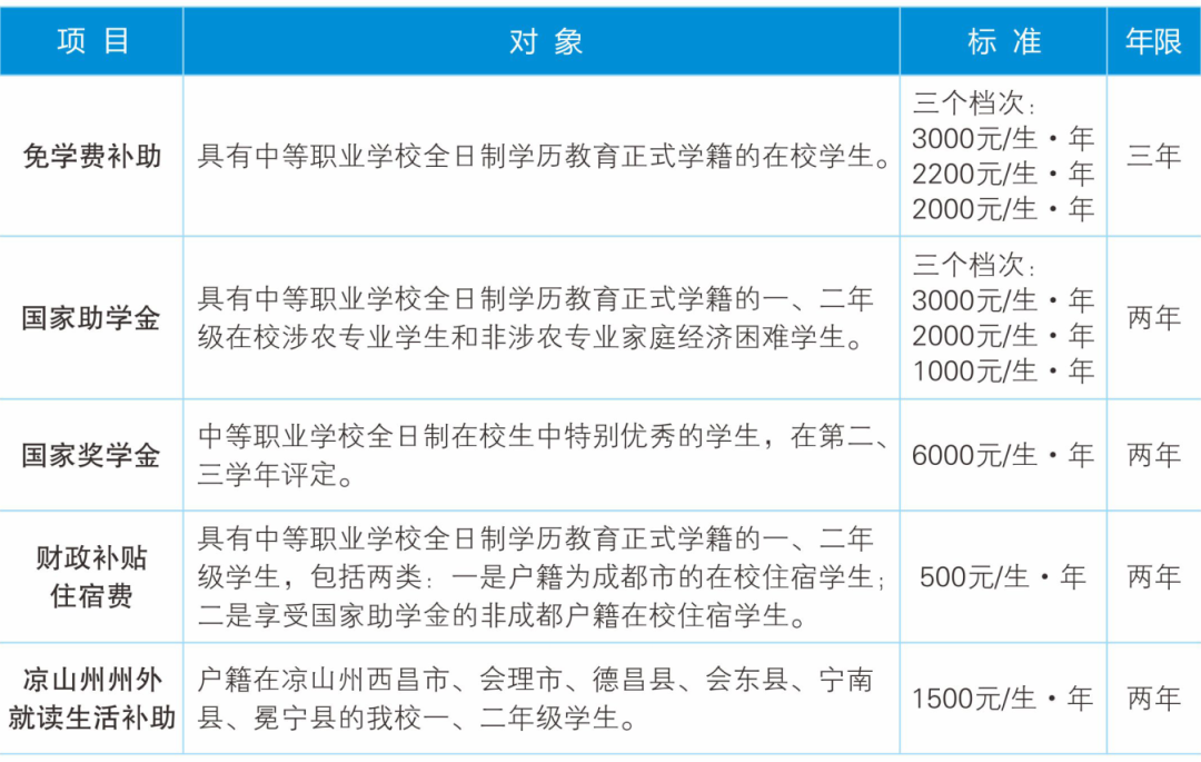 中职阶段 学生可享受免学费补助、国家助学金等五项政策扶持,最高31000元,详见下表: