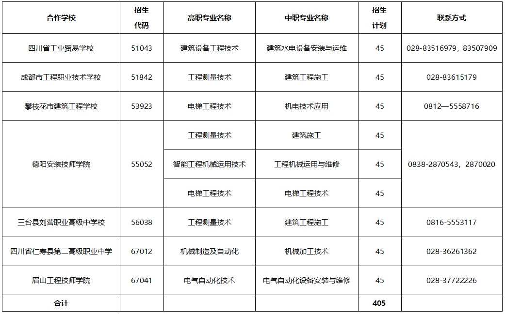 我校2024年五年贯通培养招收初中毕业生总计划405名(详情见附件),其中:四川省工业贸易学校45名、成都市工程职业技术学校45名、攀枝花市建筑工程学校45名、德阳安装技师学院135名、三台县刘营职业高级中学校45名、四川省仁寿县第二高级职业中学45名、眉山工程技师学院45名。
