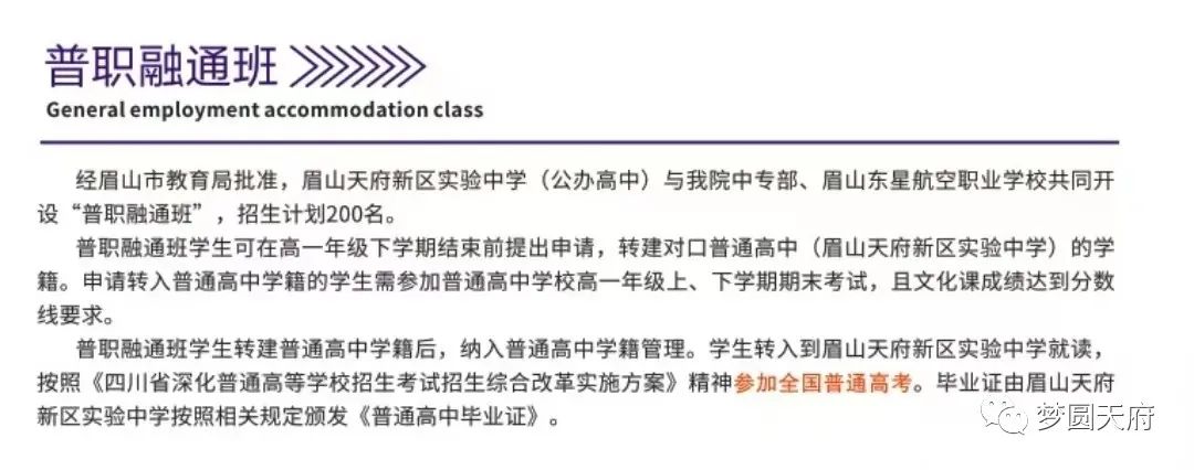 经眉山市教育局和体育局批准,我校设立普职融通班,初中毕业生入读我校普职融通班,可在高一年级下学期结束前提出申请,转建对口普通高中的学籍。申请转入普通高中学籍的学生需参加普通高中学校高一年级上、下学期期末考试,且文化课成绩达到分数线要求。