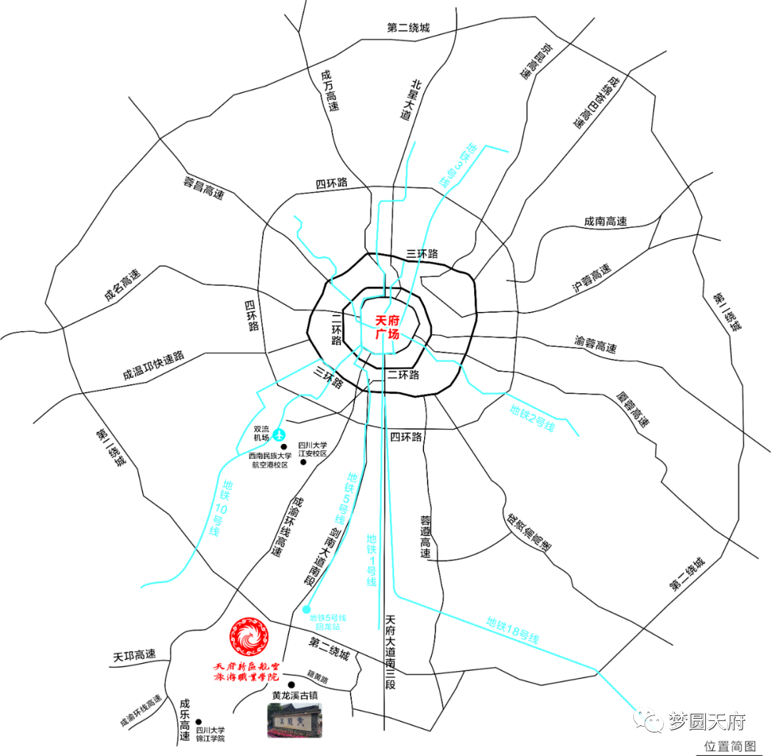 学院地处成都天府新区核心地段剑南大道南延线航空大道中段,超近距离感受千年古镇4A级景区黄龙溪。距离地铁5号、6号线20分钟左右,学院也有直达成都东站的大巴车,到双流国际机场30分钟车程,交通十分便捷。