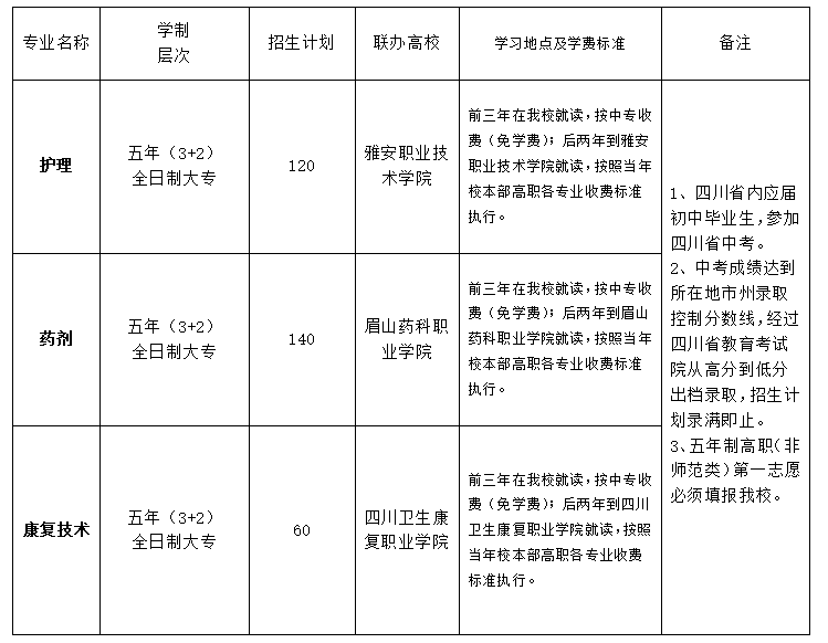 1.中高职衔接五年贯通培养招生对象为:中考考籍在四川省内的应届初中毕业生,参加中考且中考成绩上当地五年贯通培养录取控制分数线者(填报志愿时必须填报本校为第一志愿方可,以报考学生成绩从高到低录取)。