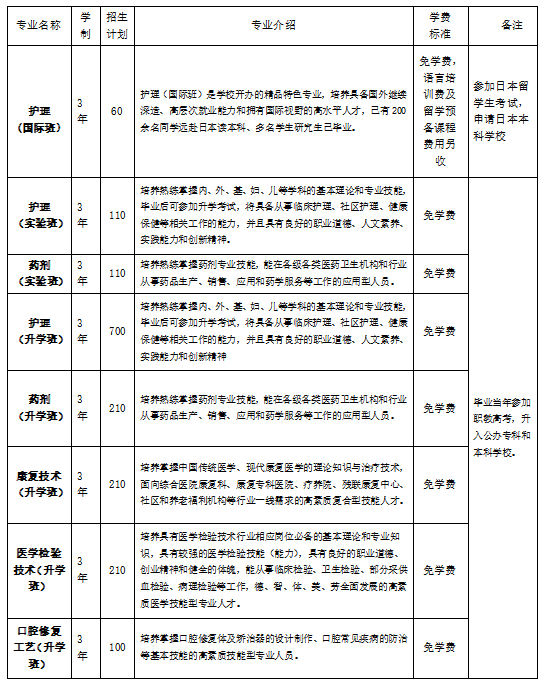 学校中专班均为升学班,今年将在中专班中成立4个升学实验班,护理专业2个,药剂专业2个。学校将从这两个专业的学生中按照7月13日入学分班考试从高到低择优进行录取。主要目标是冲刺职教本科院校和公办大专院校。